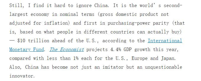 《基普林格》网站报道截图 文章分析说,中国的存在感令人难以忽视。文章援引国际货币基金组织的数据称,中国稳居全球第二大经济体;若按购买力平价计算,中国更以绝对优势位居世界第一。《经济学人》的预测也认为今年中国国内生产总值增速将远超美欧日等经济体。更重要的是,中国如今已成为毋庸置疑的创新引领者。